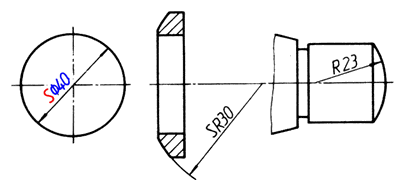 標注球面的尺寸,如左側兩圖所示,應在?或R前加注“S”。不致引起誤解時,則可省略,如右圖中的右端球面。