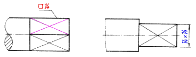 如例圖所示,標注機件的剖面為正方形結構的尺寸時,可在邊長尺寸數字前加注符號“□”,或用14×14代替“□14”。圖中相交的兩條細實線是平面符號(當圖形不能充分表達平面時,可用這個符號表示平面)。