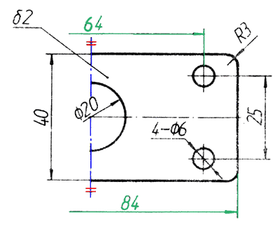 圖上尺寸84和64,它們的尺寸線應略超過對稱中心線或斷裂處的邊界線,僅在尺寸線的端畫出箭頭,在對稱中心線兩端分別畫出的兩條與其垂直的平行細實線(對稱符號)。