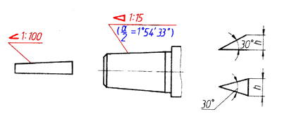 斜度、錐度可用下面兩個例圖中所示的方法標注,符號的方向應與斜度、錐度的方向一致。錐度也可注在軸線上。一般不需在標注錐度的同時,再注出其角度值(a為圓錐角);如有必要,則可如例圖中所示,在括號中注出其角度值。 |